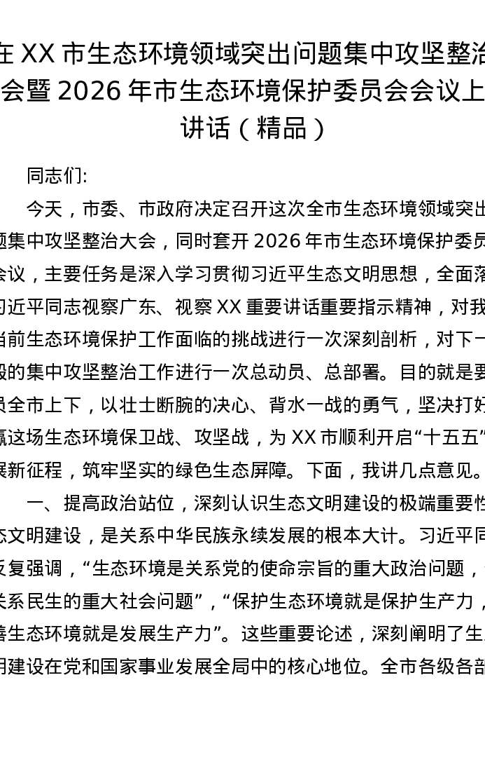 在XX市生态环境领域突出问题集中攻坚整治大会暨2026年市生态环境保护委员会会议上的讲话