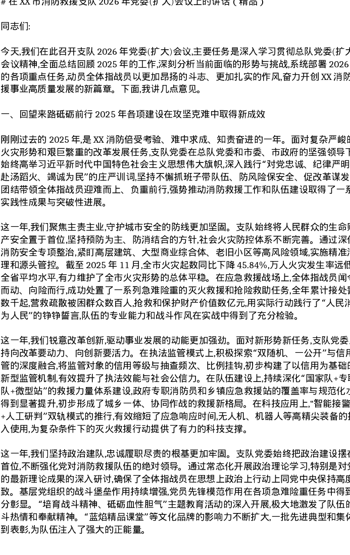 在XX市消防救援支队2026年党委(扩大)会议上的讲话