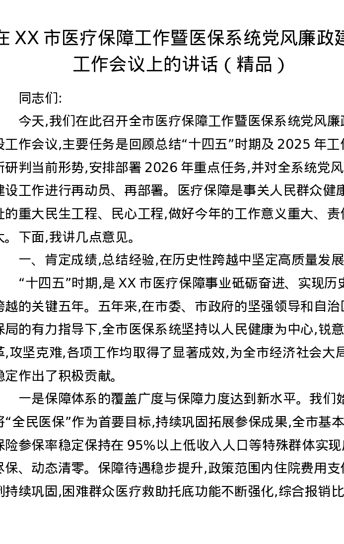 在XX市医疗保障工作暨医保系统党风廉政建设工作会议上的讲话(精品)