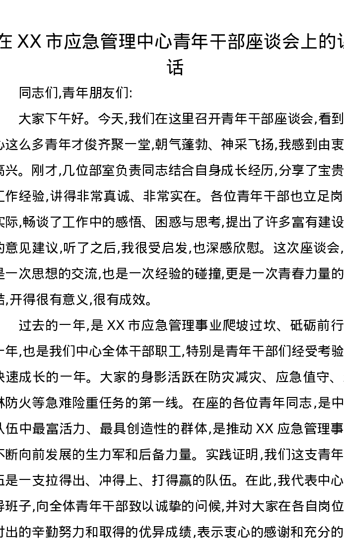 在XX市应急管理中心青年干部座谈会上的讲话