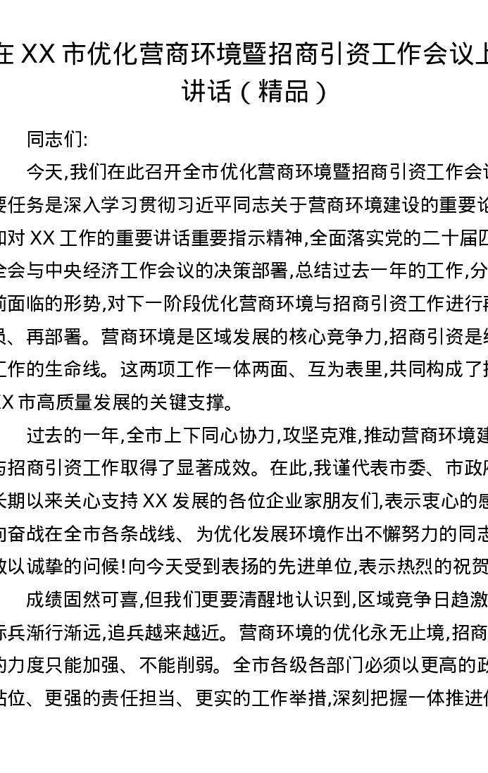 在XX市优化营商环境暨招商引资工作会议上的讲话(精品)