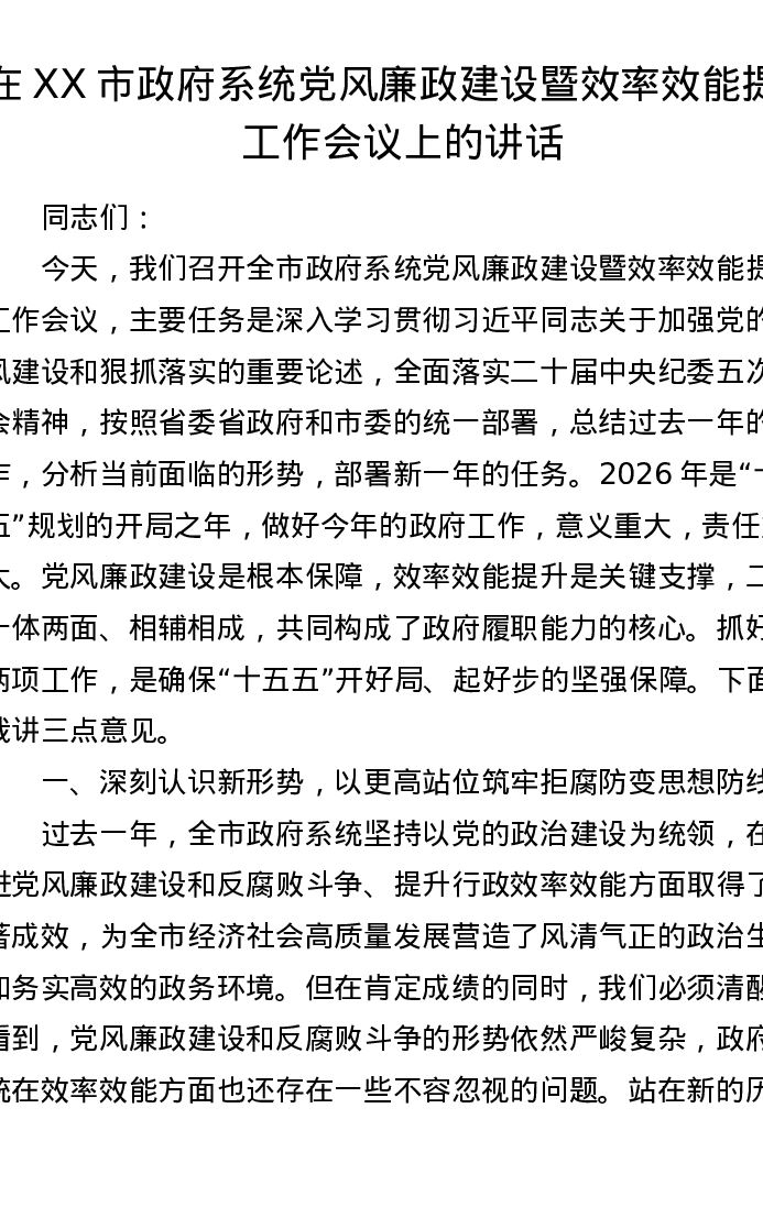 在XX市政府系统党风廉政建设暨效率效能提升工作会议上的讲话