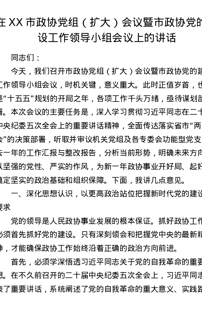 在XX市政协党组(扩大)会议暨市政协党的建设工作领导小组会议上的讲话