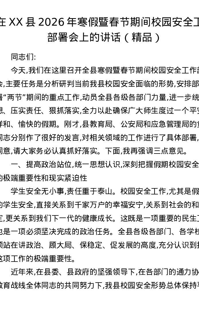 在XX县2026年寒假暨春节期间校园安全工作部署会上的讲话