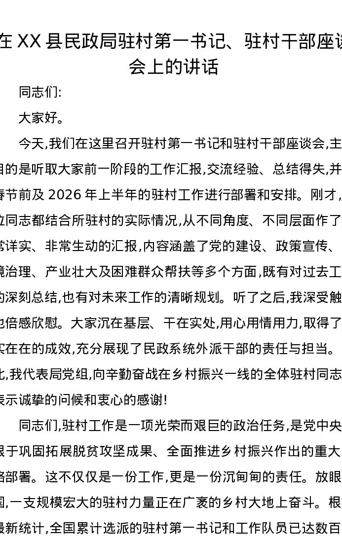 在XX县民政局驻村第一书记、驻村干部座谈会上的讲话