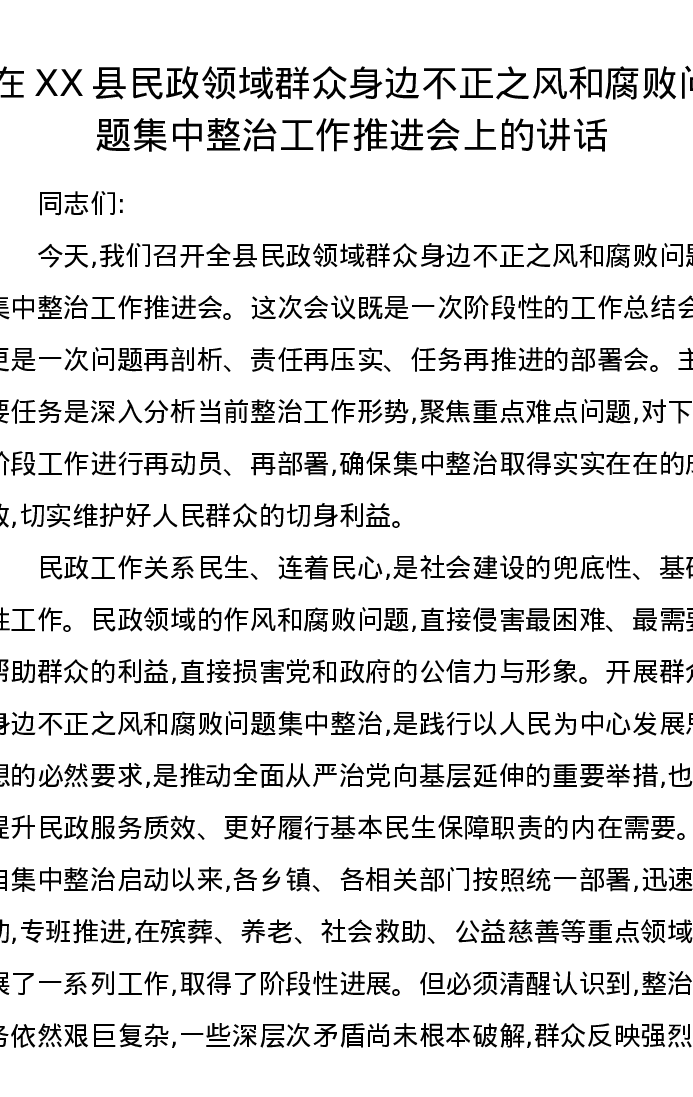 在XX县民政领域群众身边不正之风和腐败问题集中整治工作推进会上的讲话