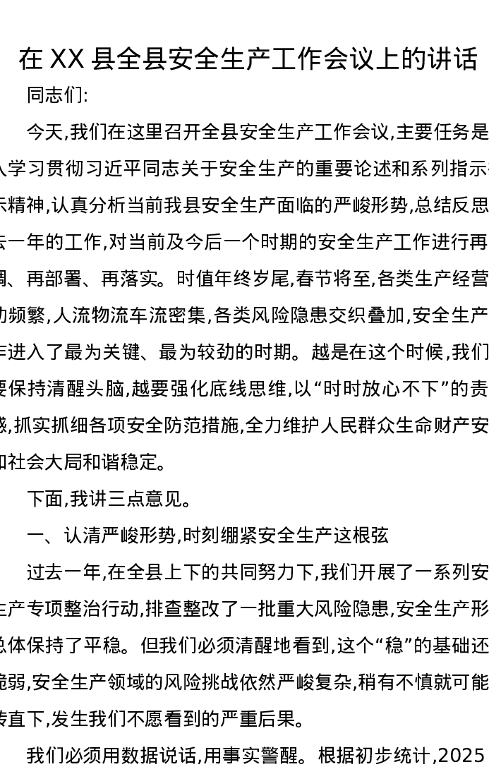 在XX县全县安全生产工作会议上的讲话