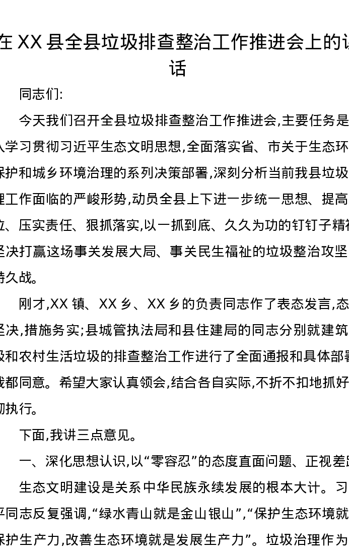 在XX县全县垃圾排查整治工作推进会上的讲话