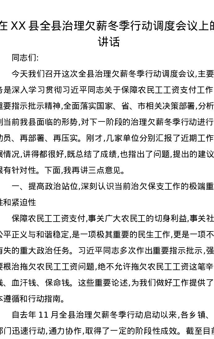 在XX县全县治理欠薪冬季行动调度会议上的讲话