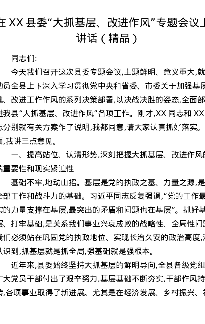 在XX县委大抓基层、改进作风专题会议上的讲话