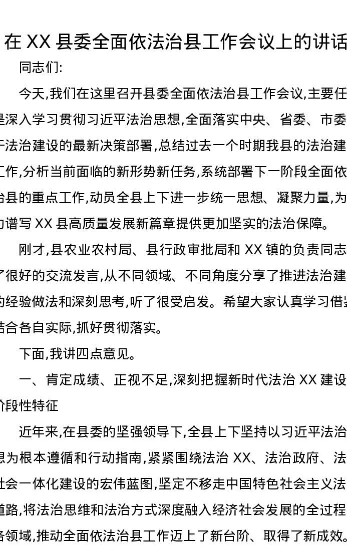 在XX县委全面依法治县工作会议上的讲话(3)