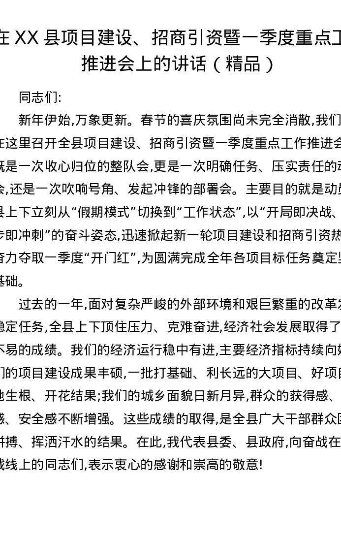 在XX县项目建设、招商引资暨一季度重点工作推进会上的讲话