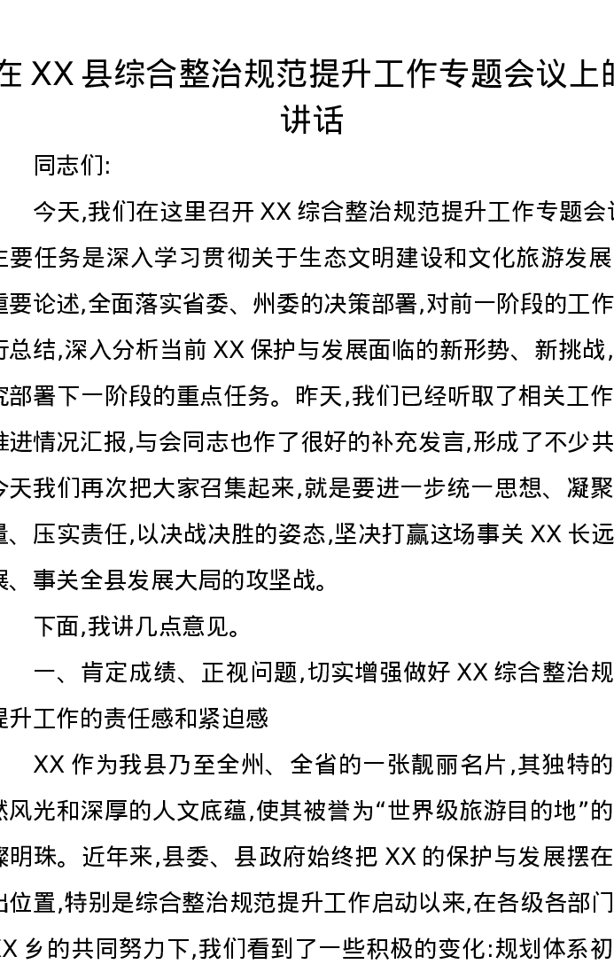 在XX县综合整治规范提升工作专题会议上的讲话