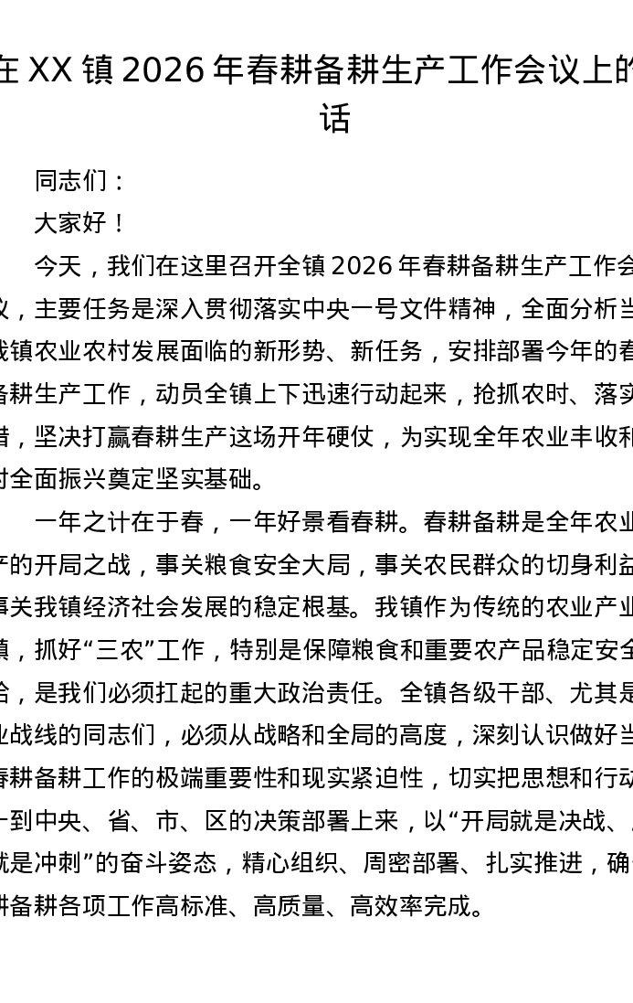 在XX镇2026年春耕备耕生产工作会议上的讲话