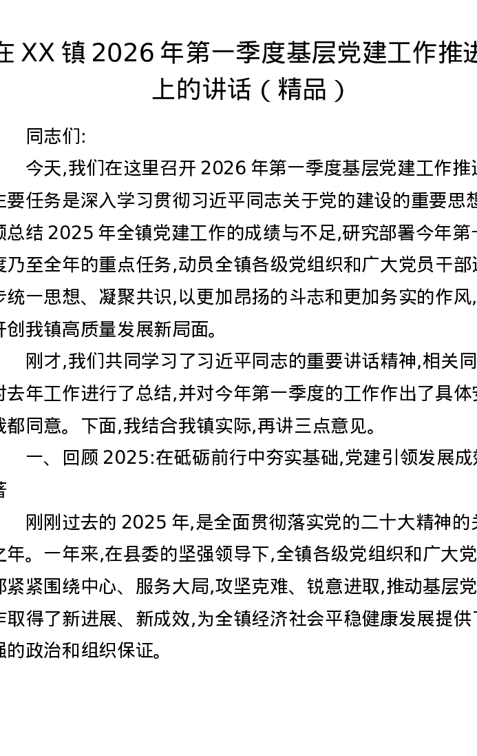在XX镇2026年第一季度基层党建工作推进会上的讲话