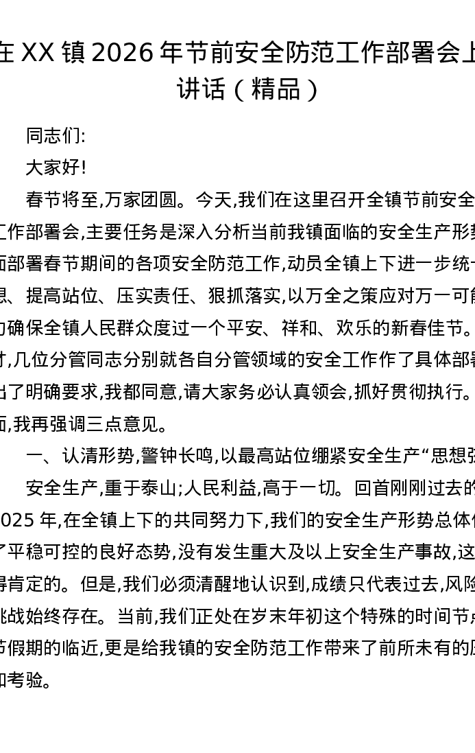 在XX镇2026年节前安全防范工作部署会上的讲话