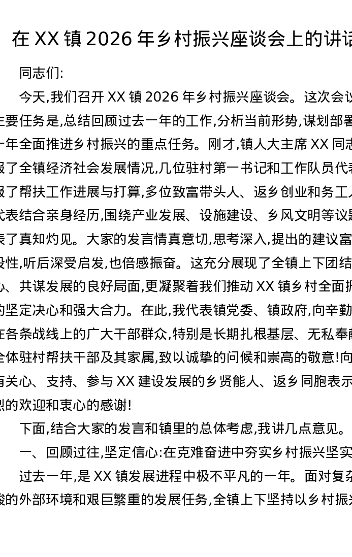在XX镇2026年乡村振兴座谈会上的讲话
