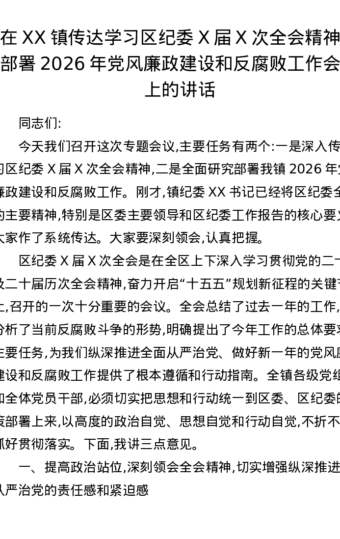 在XX镇传达学习区纪委X届X次全会精神暨部署2026年党风廉政建设和反腐败工作会议上的讲话