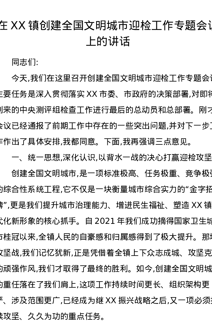 在XX镇创建全国文明城市迎检工作专题会议上的讲话