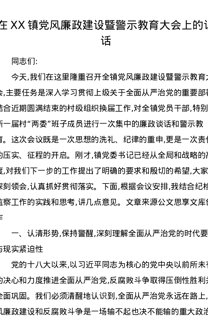在XX镇党风廉政建设暨警示教育大会上的讲话