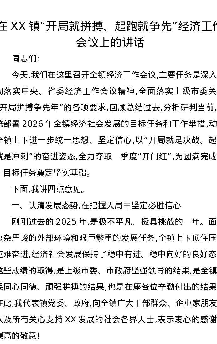在XX镇开局就拼搏、起跑就争先经济工作会议上的讲话