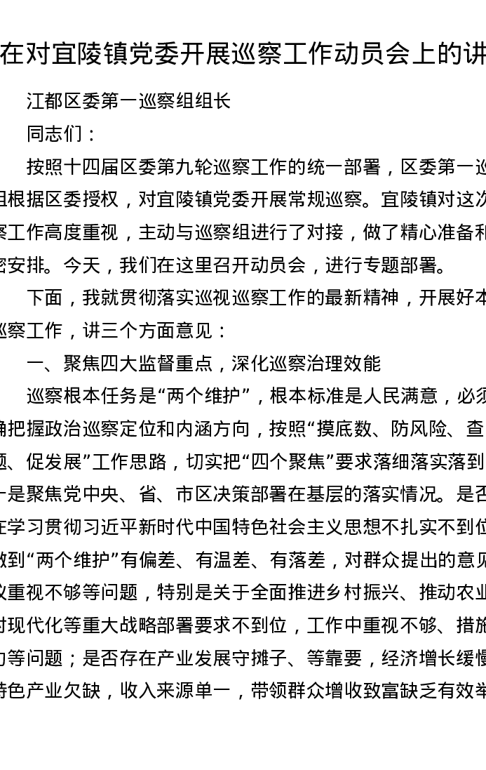 在对宜陵镇党委开展巡察工作动员会上的讲话
