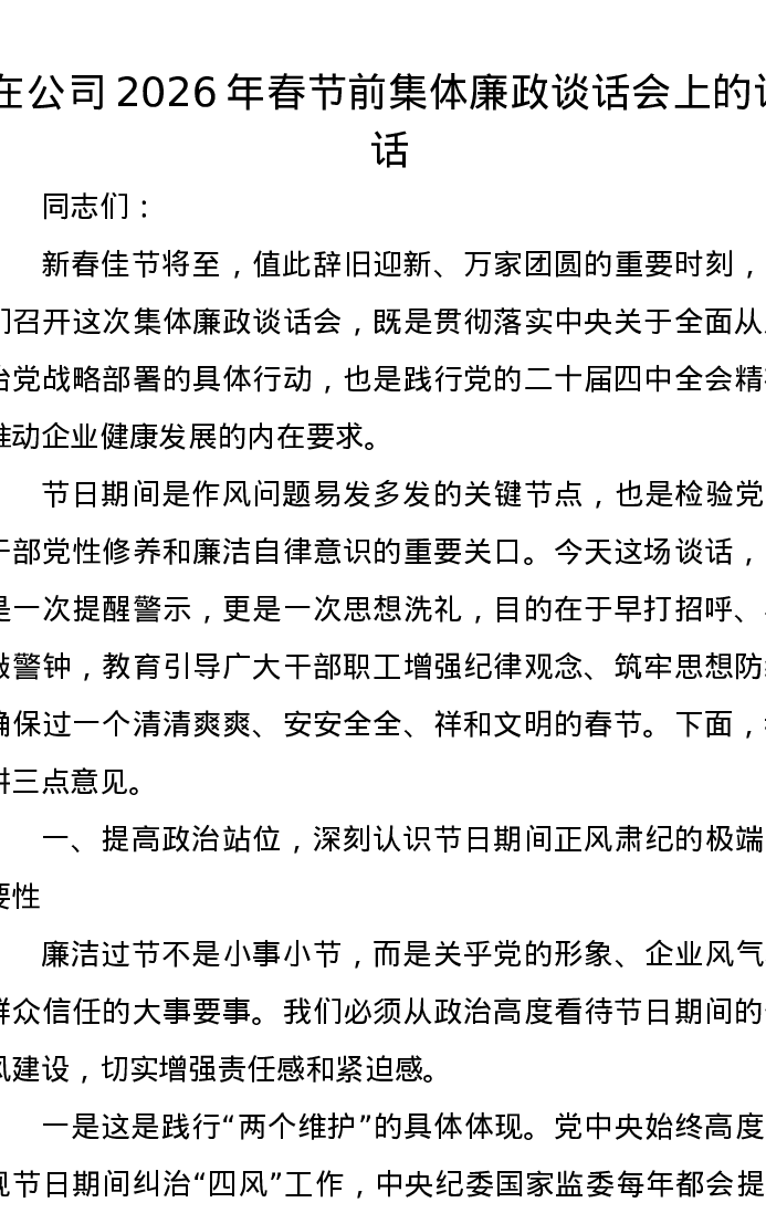 在公司2026年春节前集体廉政谈话会上的讲话