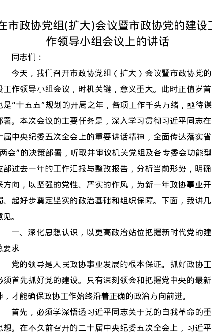 在市政协党组(扩大)会议暨市政协党的建设工作领导小组会议上的讲话