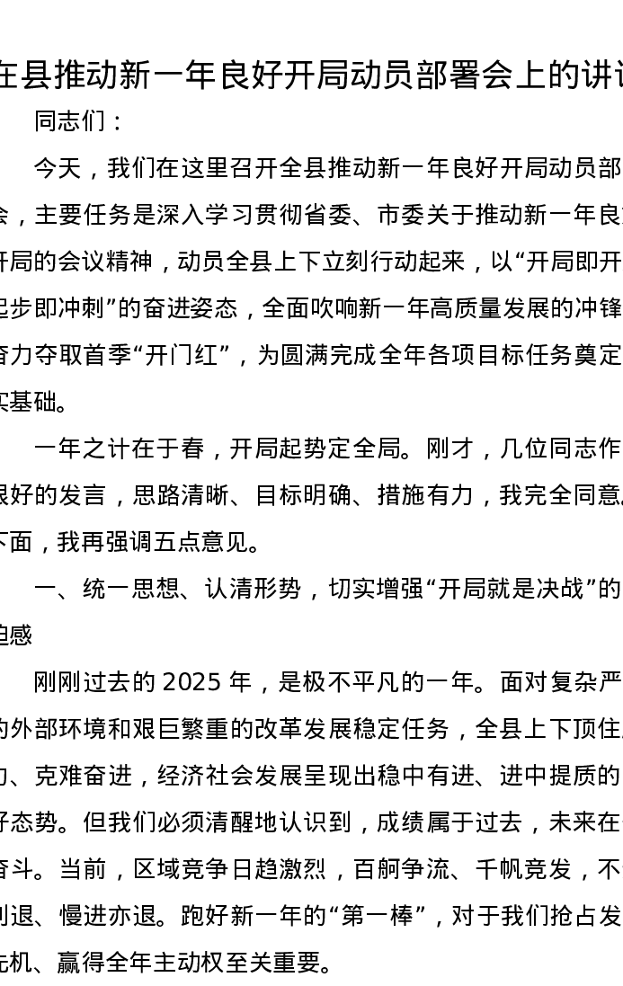 在县推动新一年良好开局动员部署会上的讲话