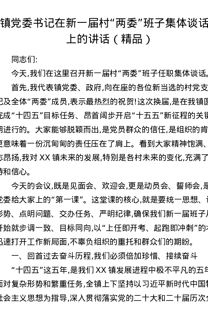 镇党委书记在新一届村两委班子集体谈话会上的讲话