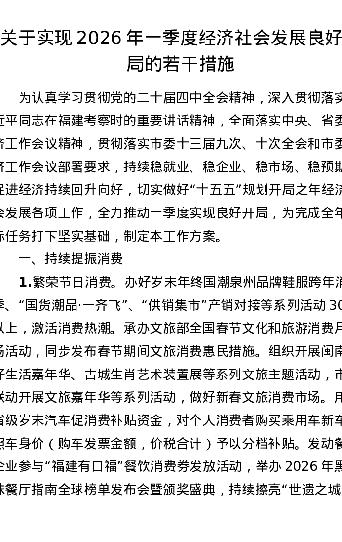 关于实现2026年一季度经济社会发展良好开局的若干措施