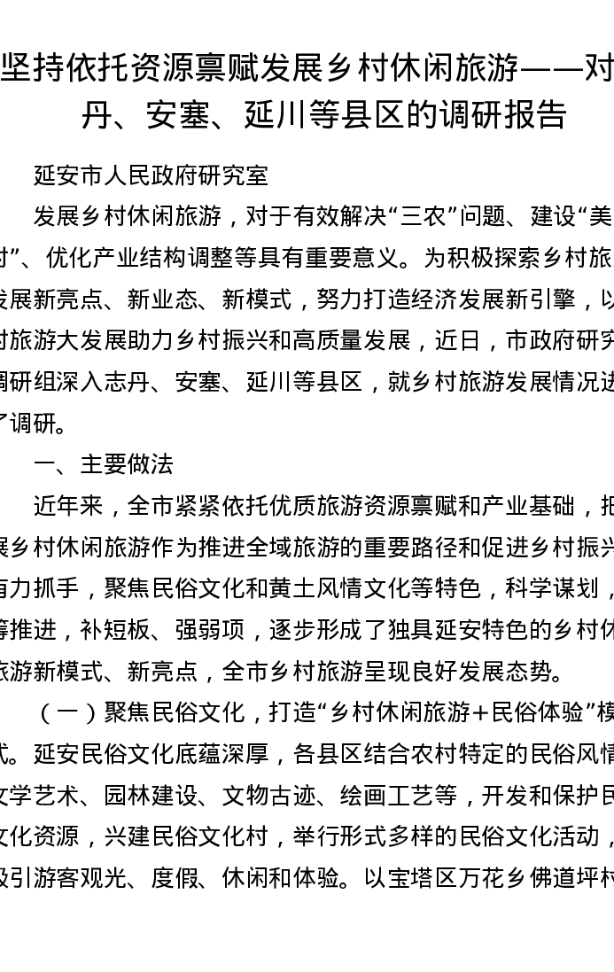 坚持依托资源禀赋 发展乡村休闲旅游——对志丹、安塞、延川等县区的调研报告