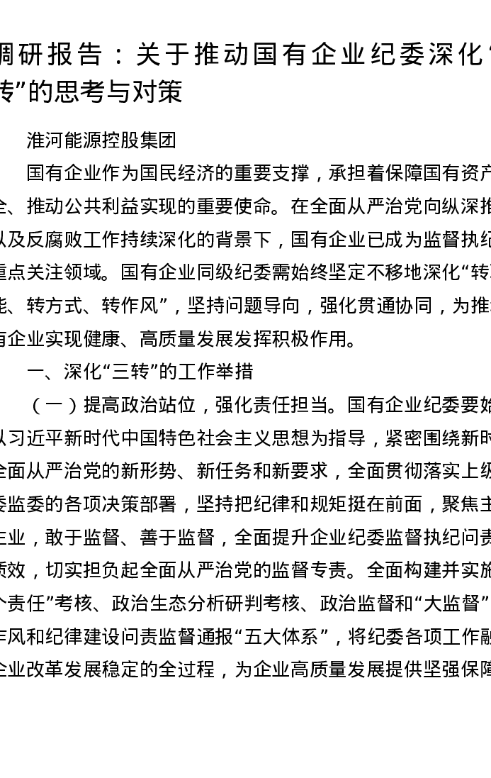 调研报告:关于推动国有企业纪委深化 三转 的思考与对策