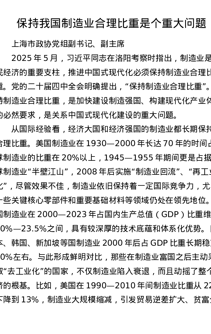保持我国制造业合理比重是个重大问题