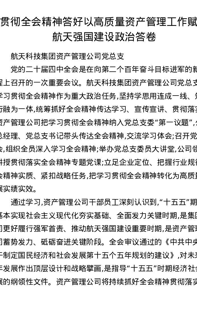 贯彻全会精神 答好以高质量资产管理工作赋能航天强国建设政治答卷