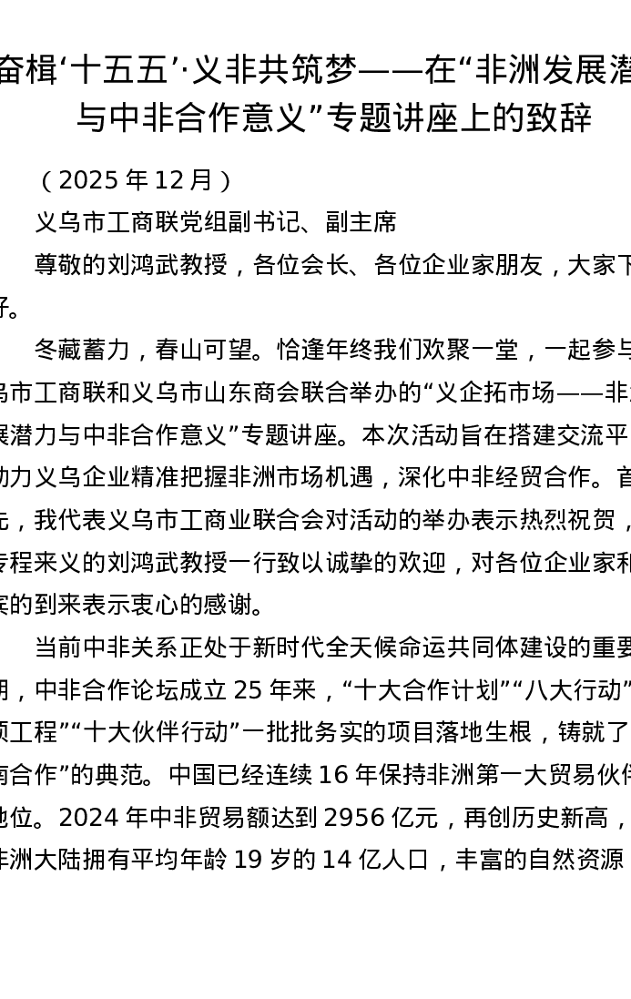 奋楫‘十五五’·义非共筑梦——在非洲发展潜力与中非合作意义专题讲座上的致辞