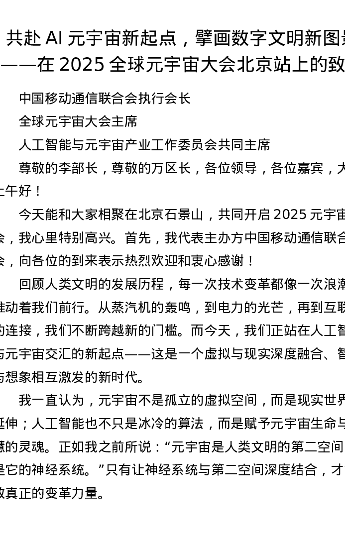 共赴AI元宇宙新起点,擘画数字文明新图景——在2025全球元宇宙大会北京站上的致辞
