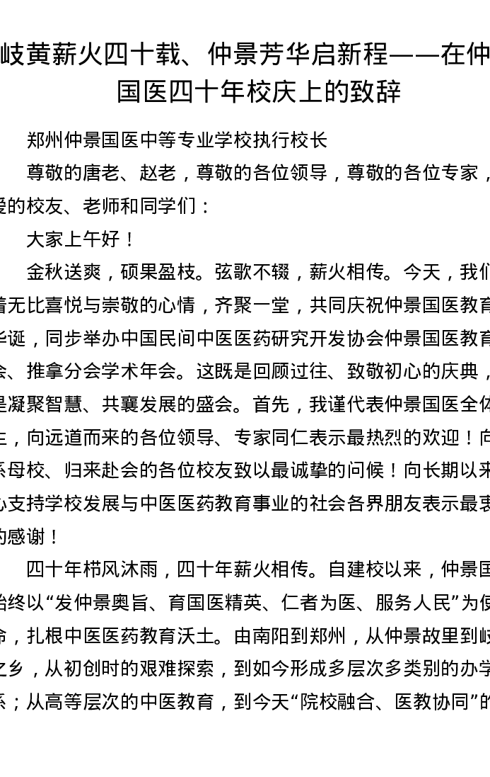 岐黄薪火四十载、仲景芳华启新程——在仲景国医四十年校庆上的致辞