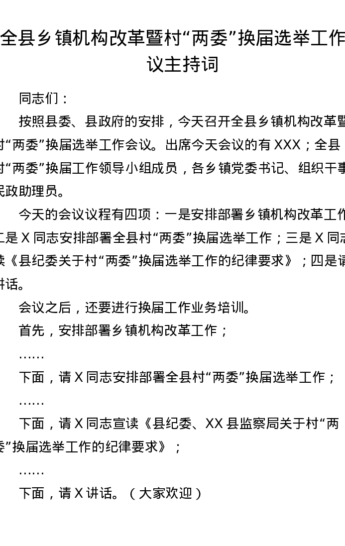 全县乡镇机构改革暨村两委换届选举工作会议主持词