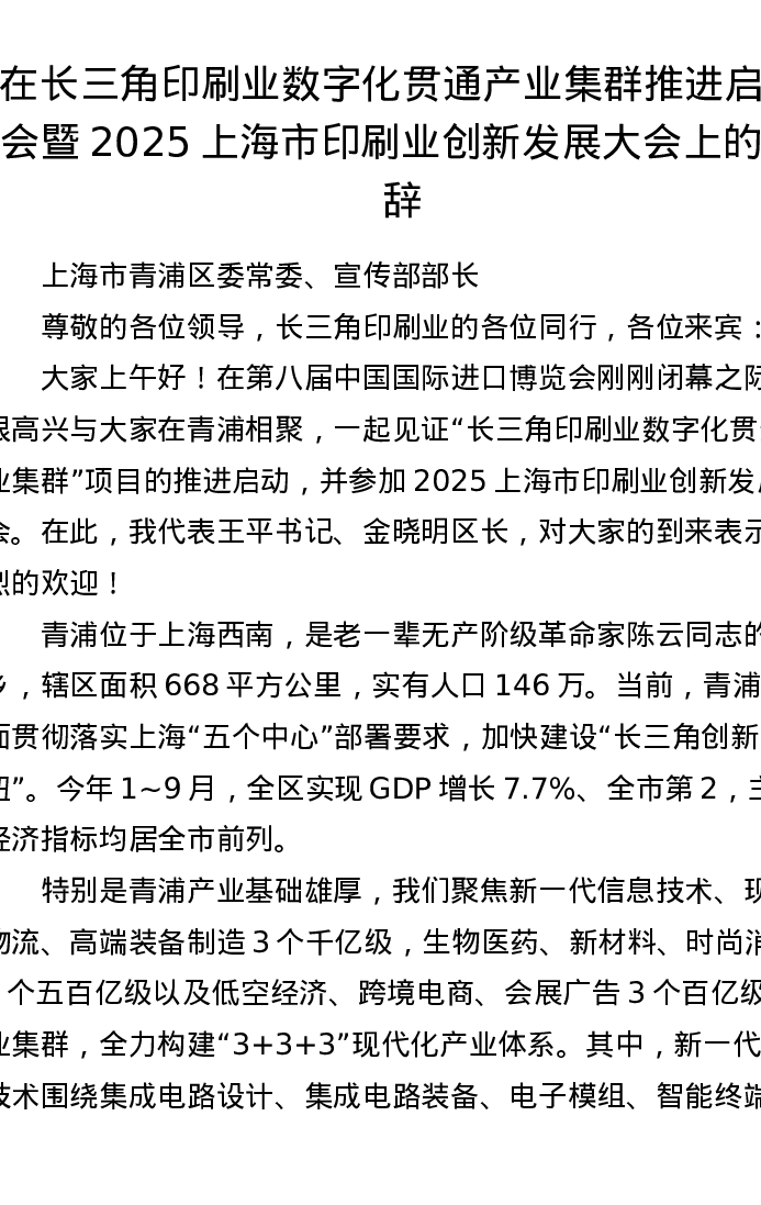 在长三角印刷业数字化贯通产业集群推进启动会暨2025上海市印刷业创新发展大会上的致辞