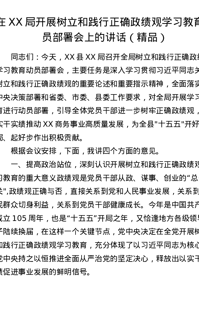 在XX局开展树立和践行正确政绩观学习教育动员部署会上的讲话