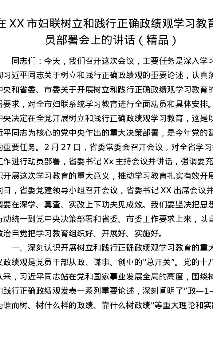 在XX市妇联树立和践行正确政绩观学习教育动员部署会上的讲话
