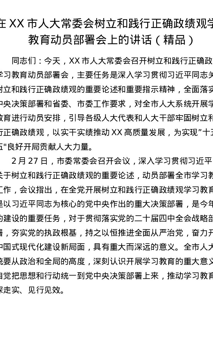 在XX市人大常委会树立和践行正确政绩观学习教育动员部署会上的讲话