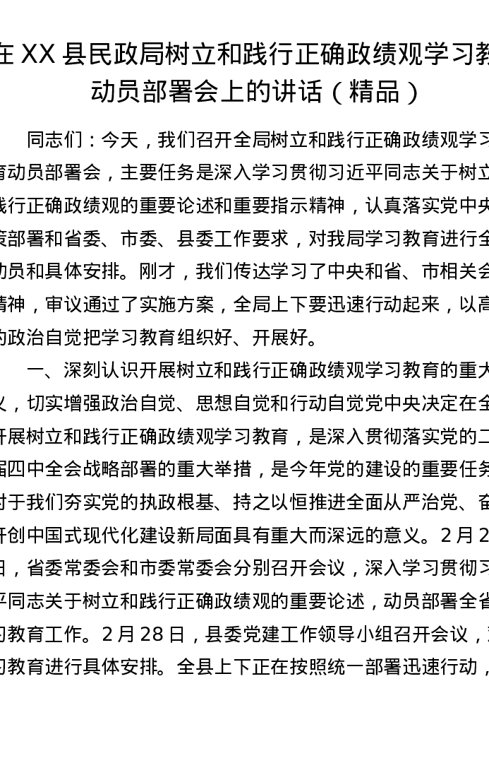 在XX县民政局树立和践行正确政绩观学习教育动员部署会上的讲话