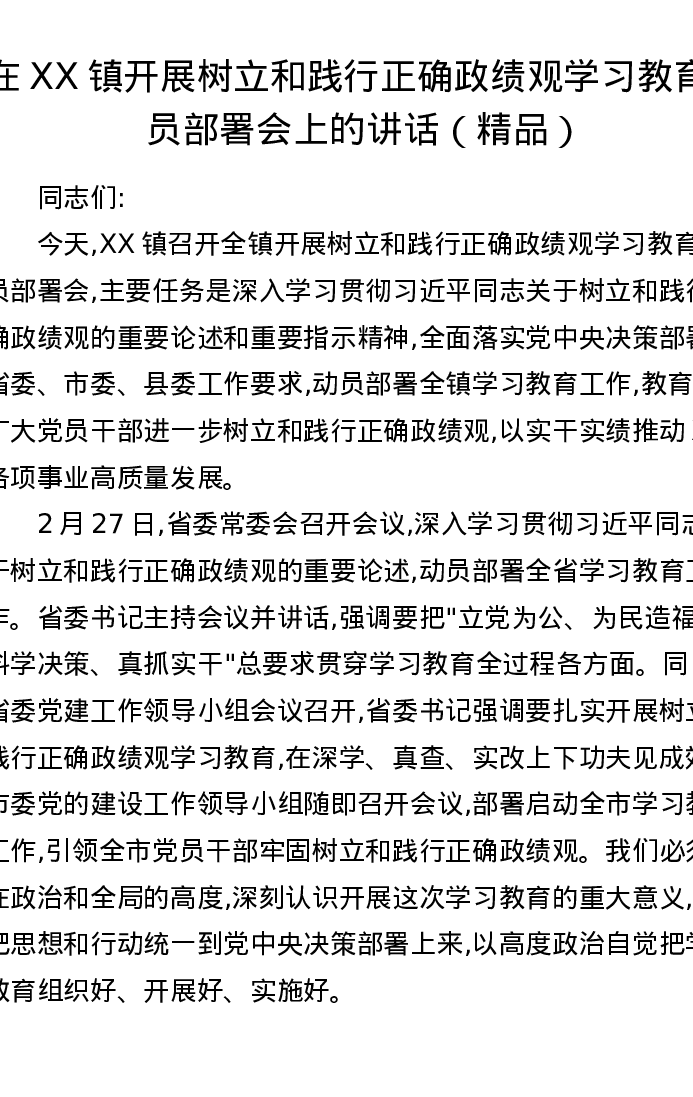 在XX镇开展树立和践行正确政绩观学习教育动员部署会上的讲话
