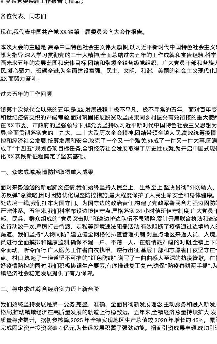 乡镇党委换届工作报告