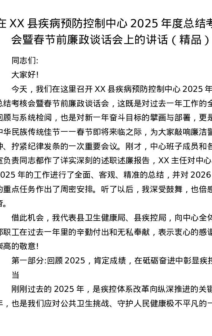 在XX县疾病预防控制中心2025年度总结考核会暨春节前廉政谈话会上的讲话(精品)