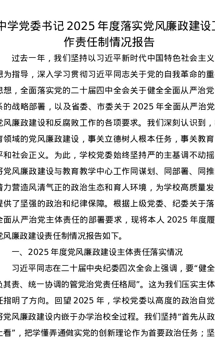中学党委书记2025年度落实党风廉政建设工作责任制情况报告