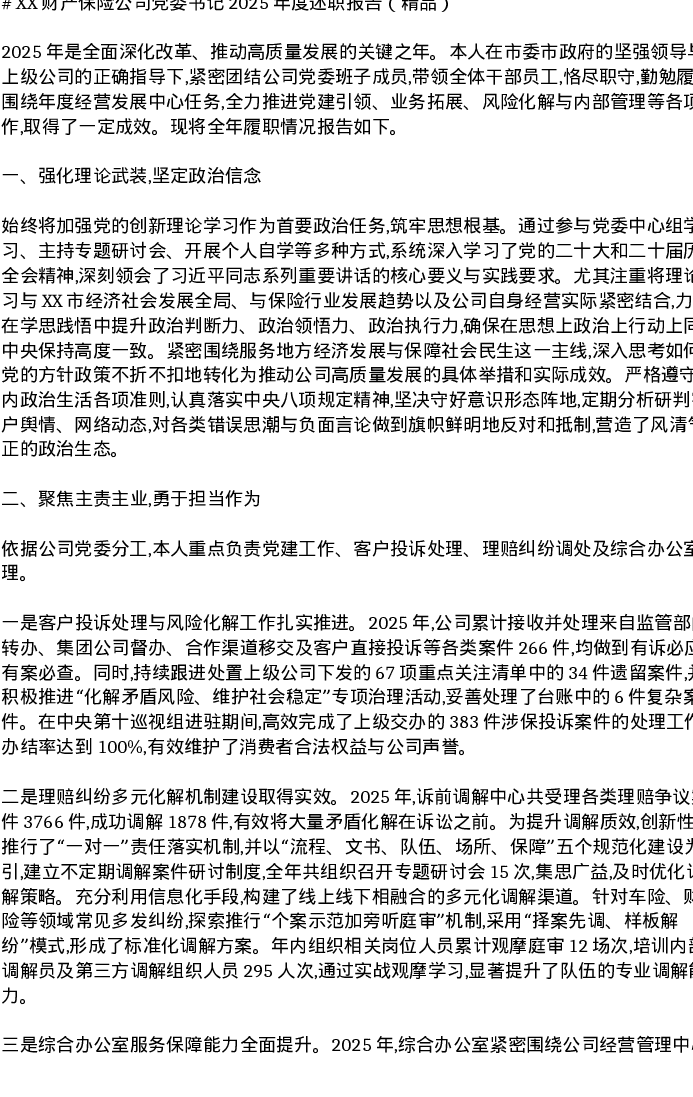 XX财产保险公司党委书记2025年度述职报告