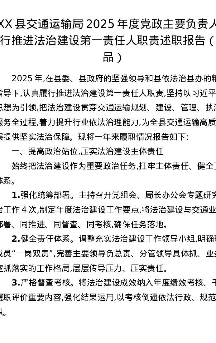 XX县交通运输局2025年度党政主要负责人履行推进法治建设第一责任人职责述职报告